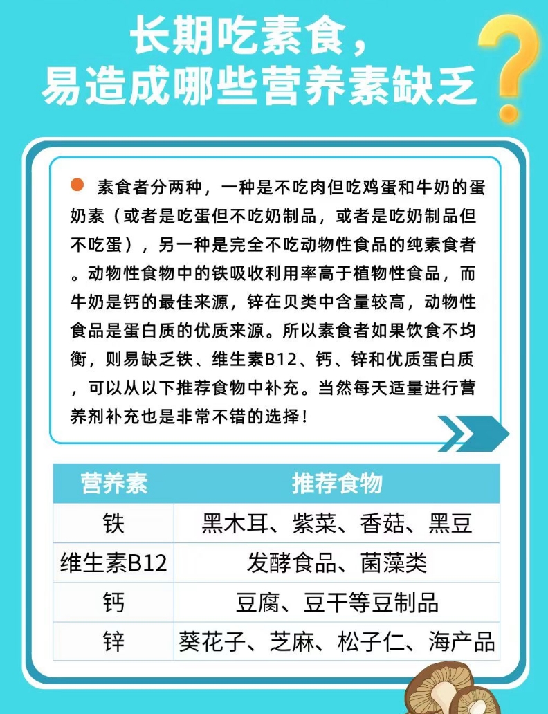 素食者分两种,一种是不吃肉但吃鸡蛋和牛奶的蛋奶素(或者是吃蛋但不吃奶制品,或者是吃奶制品但不吃蛋),另一种是完全不吃动物性食品的纯素食者。动物性食物中的铁吸收利用率高于植物性食品,而牛奶是钙的最佳来源,锌在贝类中含量较高,动物性食品是蛋白质的优质来源。所以素食者如果饮食不均衡,则易缺乏铁、维生素B12、钙、锌和优质蛋白质,可以从以下推荐食物中补充。当然每天适量进行营养剂补充也是非常不错的选择!