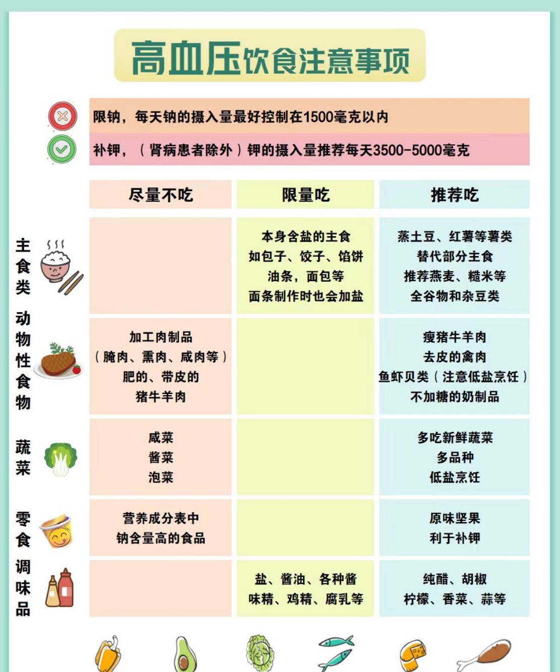 限钠,每天钠的摄入量最好控制在1500毫克以内,补钾,(肾病患者除外)钾的摄入量推荐每天3500-5000毫克