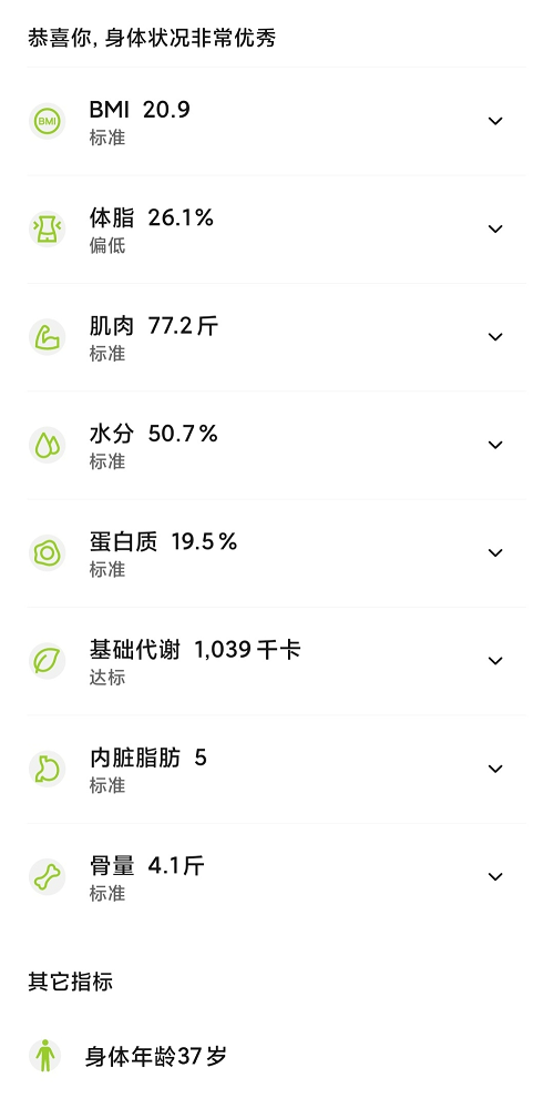 我是属于中年减脂用户群体,经过25天左右的减脂调理,体重竟减了6斤,在这个年纪居然能短时间内瘦这么多还不反弹,而且这都是在我身体数据很良好的前提下实现的,实在是出乎意料。