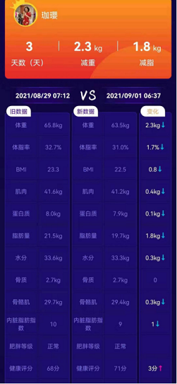 我每天早上测燃脂、秤体重乐此不疲,不敢相信短短3天身体数据竟有大变化,居然减得比我一个月暴汗运动还多,每天简单练练瑜伽,吃吃喝喝还能有超赞的塑形效果,绝了。