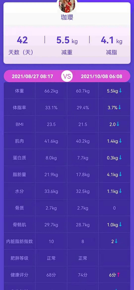我执行了42天优碳减脂短期调理方案,瘦了11斤,内脏脂肪指数从10降到8,腰围缩小了10cm!