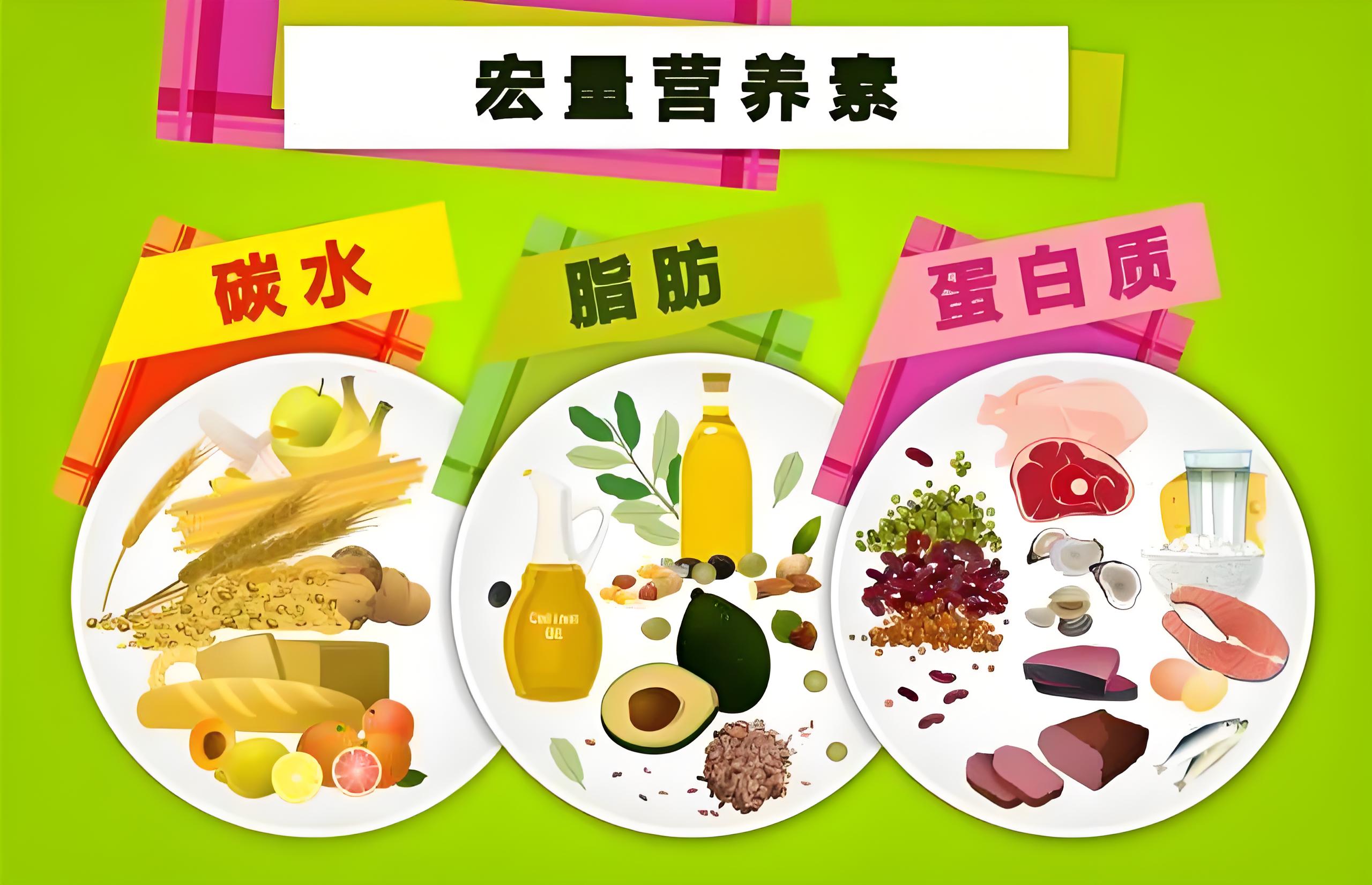 宏量营养素:一般指的是碳水化合物、脂肪和蛋白质,这些是人体所需的重要营养素。